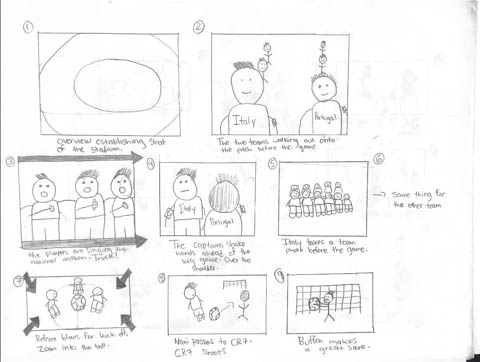 - Truck -> Camera follows the players as their national anthem is sung, as they anxiously wait for the biggest game of the season to start.